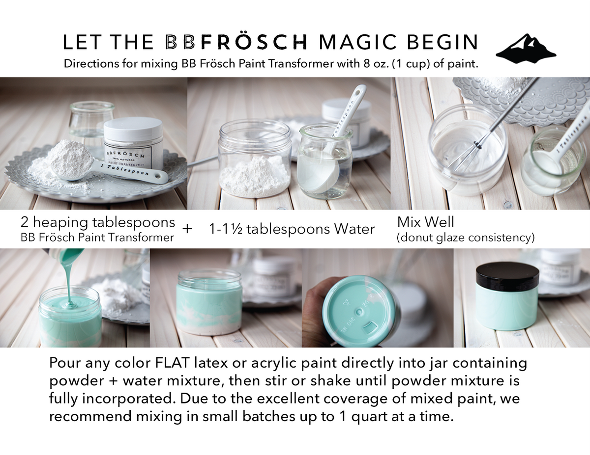In a separate quart-sized container (we recommend a clear container so you can see when the powder+water mixture is fully incorporated), mix the contents of 1 small jar BB Frösch Paint Transformer with 4 to 5 tablespoons water until a thick but creamy “donut glaze” consistency is achieved. Too pasty? Add water! Add FLAT FINISH paint and stir WELL until powder+water mixture is fully incorporated. Store any unused paint in an airtight container.
